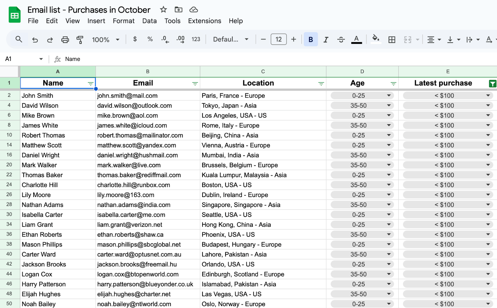 Take a look at my email list that I created with ChatGPT (it would have taken me ages to come up with so many fake names and emails). My table also has columns for Location, Age, and Latest purchase.