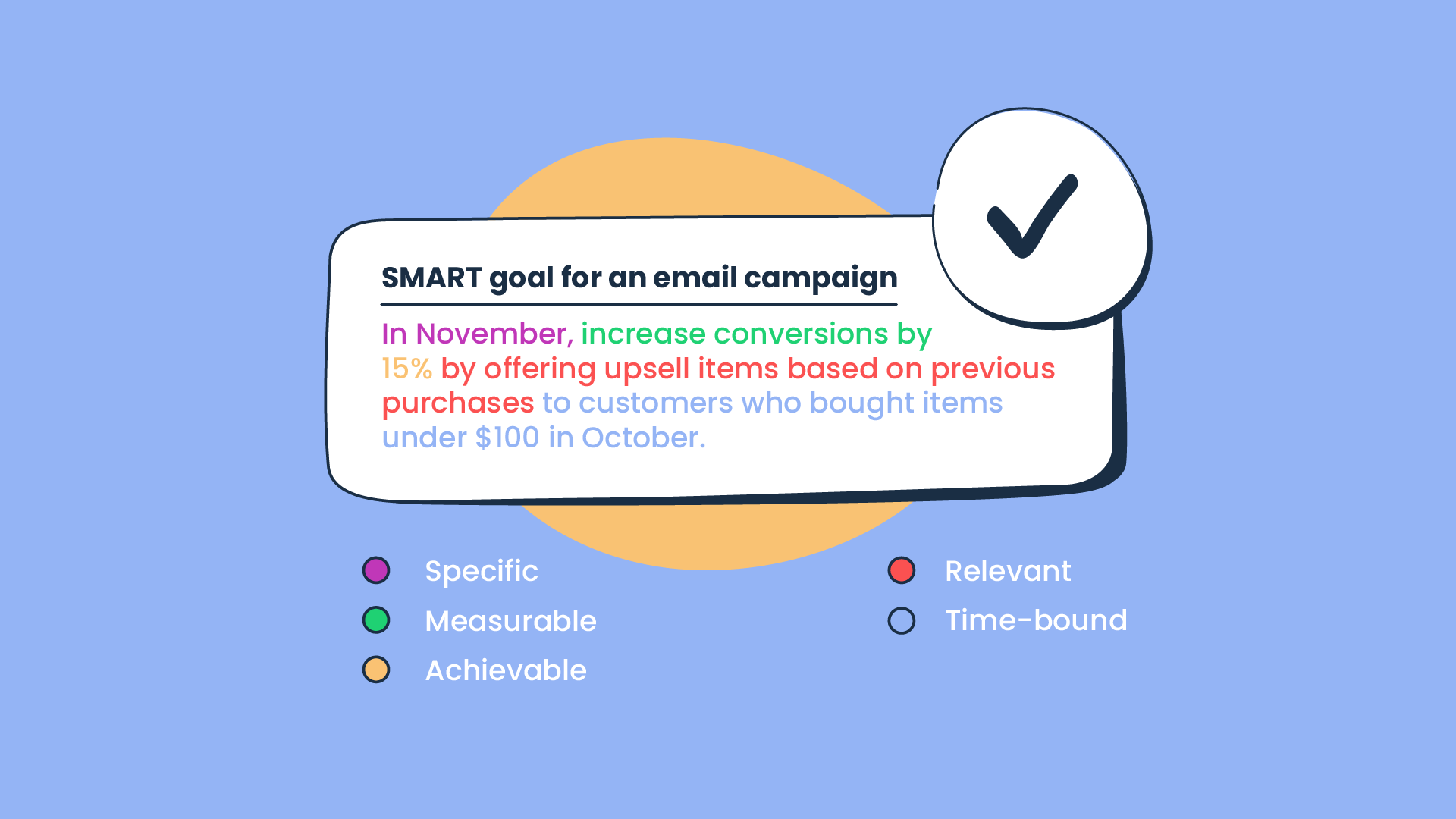 Begin by clearly defining your goals and the metrics you’ll use to evaluate whether you’ve achieved them. Goals like “I want to improve engagement,” or “I want to reduce unsubscribe rates” are too vague. They have to be specific, measurable, achievable, relevant, and time-bound (SMART).
