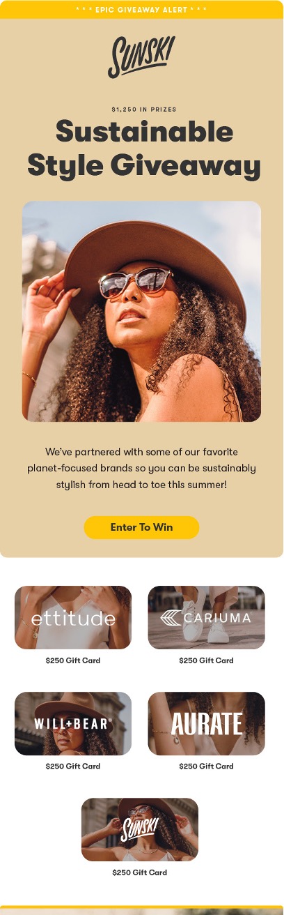 Sunski, the sunglasses and lifestyle apparel brand, frequently holds giveaways for its customers and notifies them via email. Just last summer, Sunski held what it called an “epic giveaway,” where it offered several prizes in multiple drip campaigns spread across several days.