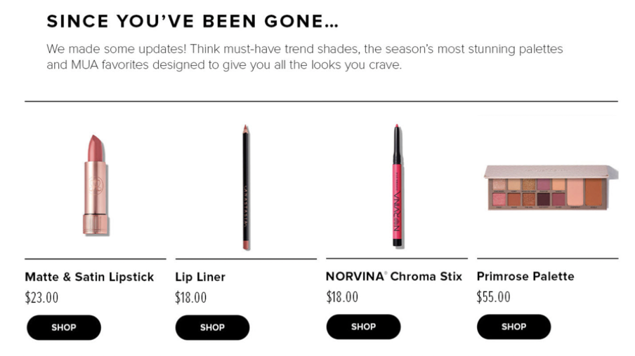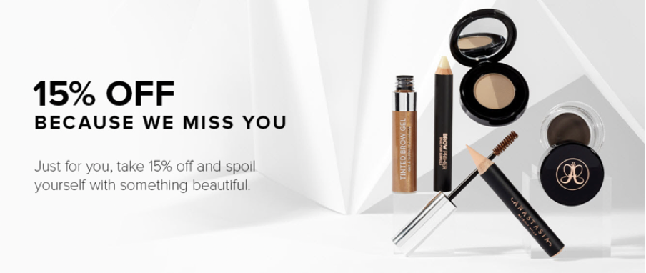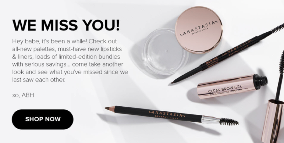 Anastasia Beverly Hills sends its own drip reactivation campaign titled “We Miss You”.