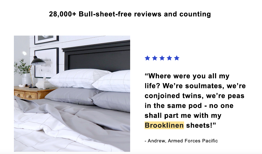 Using its own brand style, Brooklinen shows the email recipients some reviews left by other buyers.