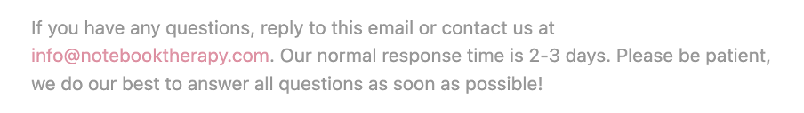 Inside the email itself, Notebook Therapy adds another thank you for ordering, as well as resources that go with the customer intent.