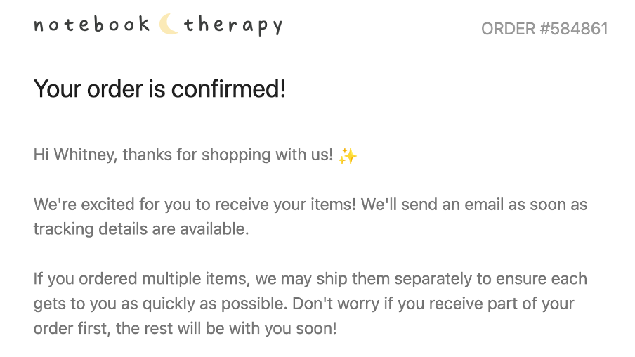 Notebook Therapy takes its order confirmation drip campaign a step further by adding two more emails, which play a distinct role in the customer’s post-purchase experience.