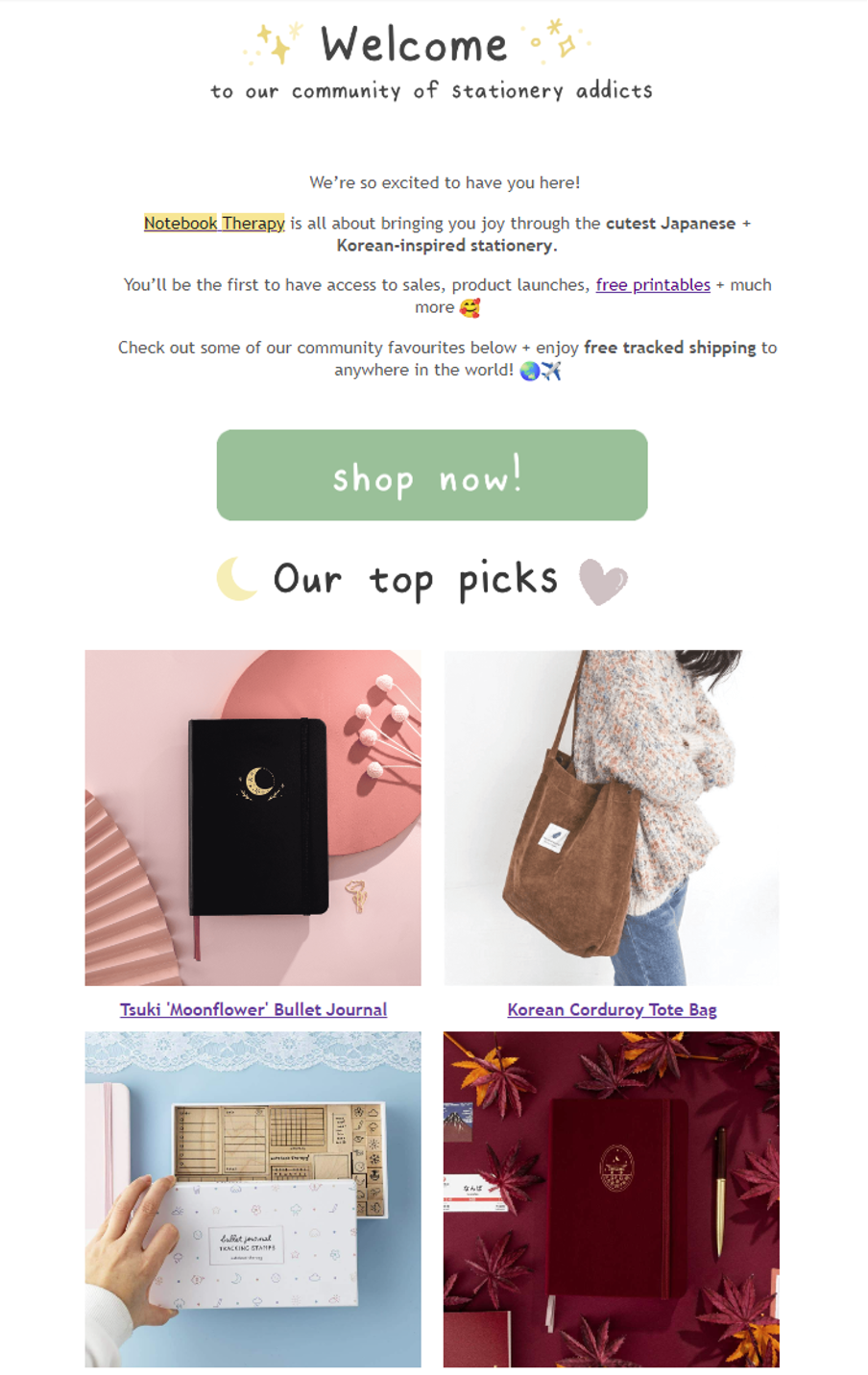 The same day you get your initial order confirmation email, you also get a welcome email that explains a little more about Notebook Therapy and what it does. Plus, within the same email, added are a few popular product recommendations to get existing customers thinking about their next purchase.