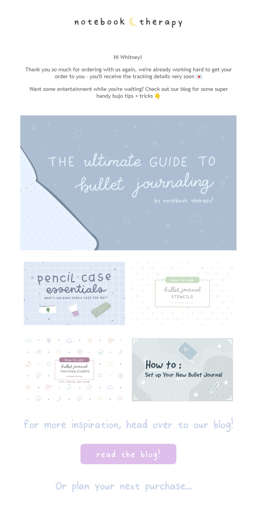 For most businesses, this should be a single neutral order confirmation email, not a sales pitch. But, it can also be in the form of a drip campaign, just like the one sent by Notebook Therapy.