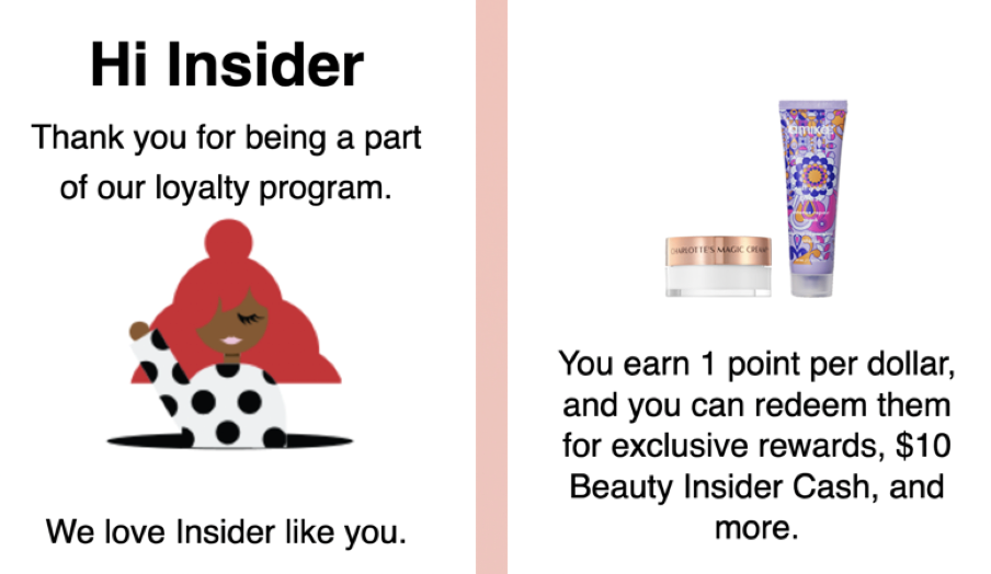 Using the first email, Sephora addresses their loyalty program members and explains to them that they earn one point per every dollar they spend.