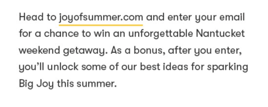 To increase the giveaway participation rate, Sunski promises a free list of the best ideas for sparking joy this summer. Also, it clearly explains the steps for getting a chance to win a weekend getaway.