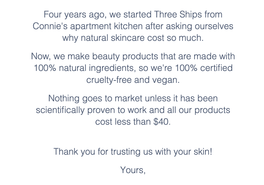 In this copy, instead of trying to impress everyone, Three Sips uses relevant content that addresses the pain points of their target audience – women who are looking for natural beauty products. Smart move, right?