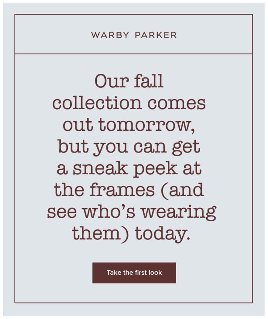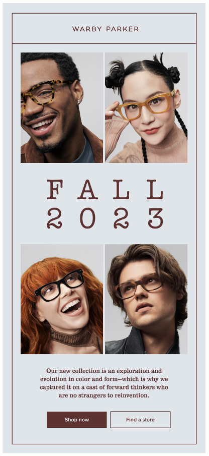 As the second email in the campaign, Warby Parker sends the full “Fall product drop” the next day, revealing what they teased in their previous email.