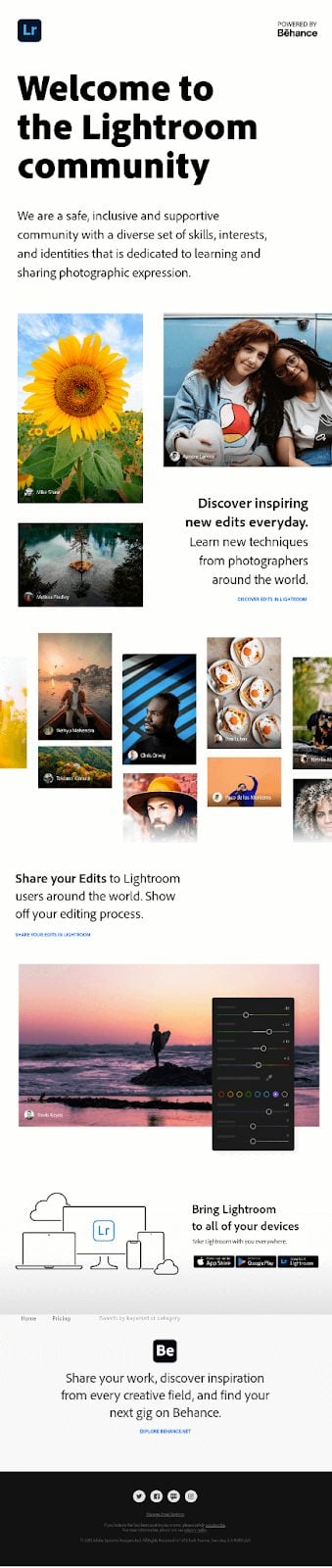 - It offers useful links to instruct the users on how the product improves their creative flow, leading either to the Lightroom blog or their knowledge base. And it softly introduces the fact that Lightroom is a well-integrated, cross-platform, solution.