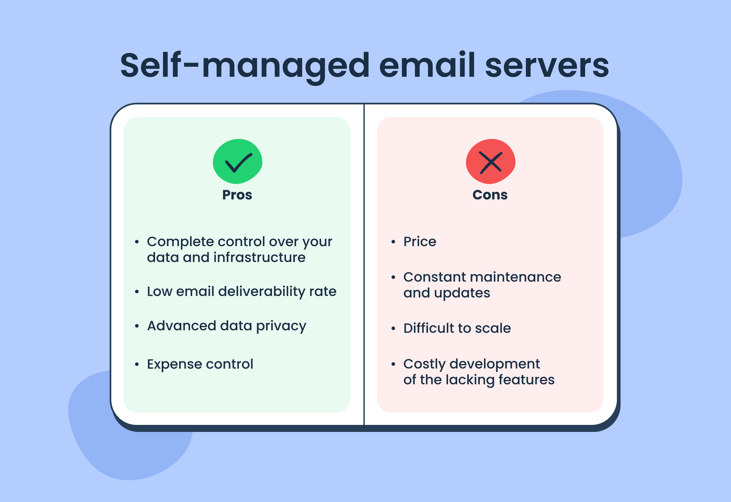 - Low email deliverability. When choosing a self-managed email server be ready to see a low email deliverability rate, especially at the very beginning. Establishing and maintaining a good sender reputation takes constant effort, expertise, and time.