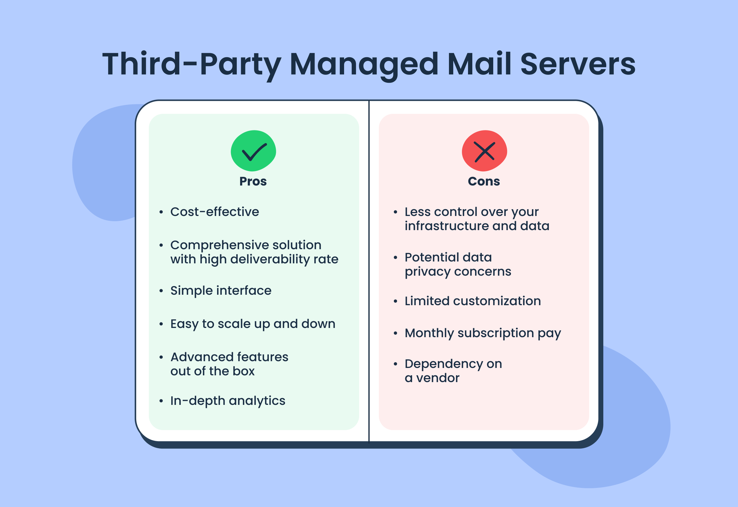 - Expensive. A self-managed mail server is just a part of the email infrastructure you’ll need to send emails. It takes a significant investment in hardware, software, and skilled IT staff, such as developers, DevOps, security specialists to prevent hacker attacks, and deliverability specialists to set up smooth delivery of emails, and manage scalability.