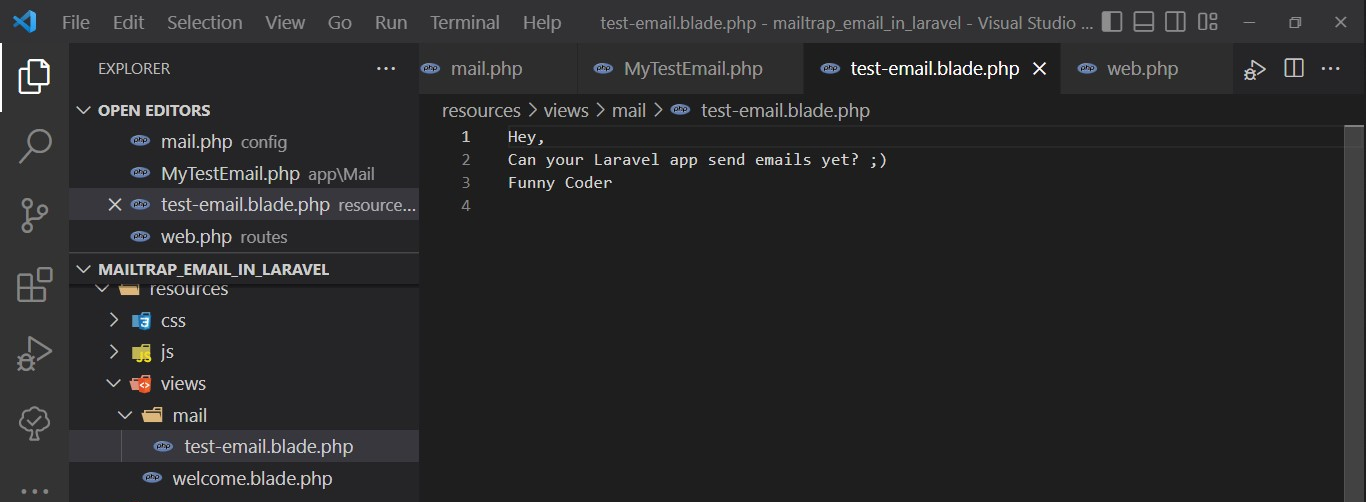 To send HTML email in Laravel, all you have to do is add HTML code to your Blade view file, which in the case of this tutorial is test-email.blade.php.
