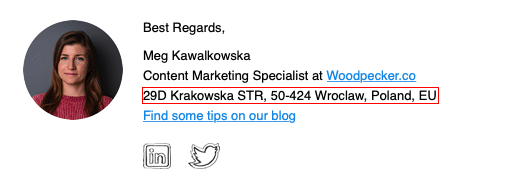 In the light of the CAN-SPAM act you should let your prospects know where your company’s office is located. Your email signature is a perfect place for that.