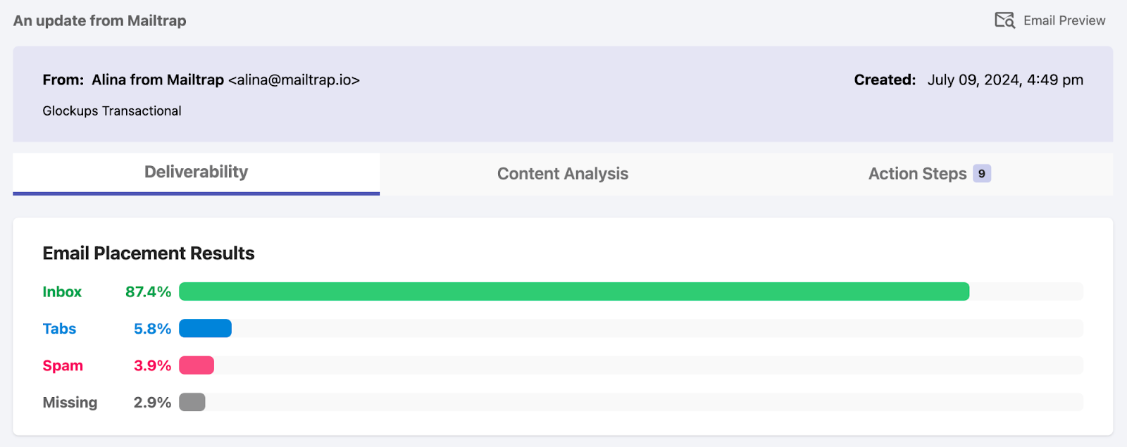 | Mailtrap | Inbox: 78.8% Tabs: 4.8% Spam: 14.4% Missing: 2.0% |