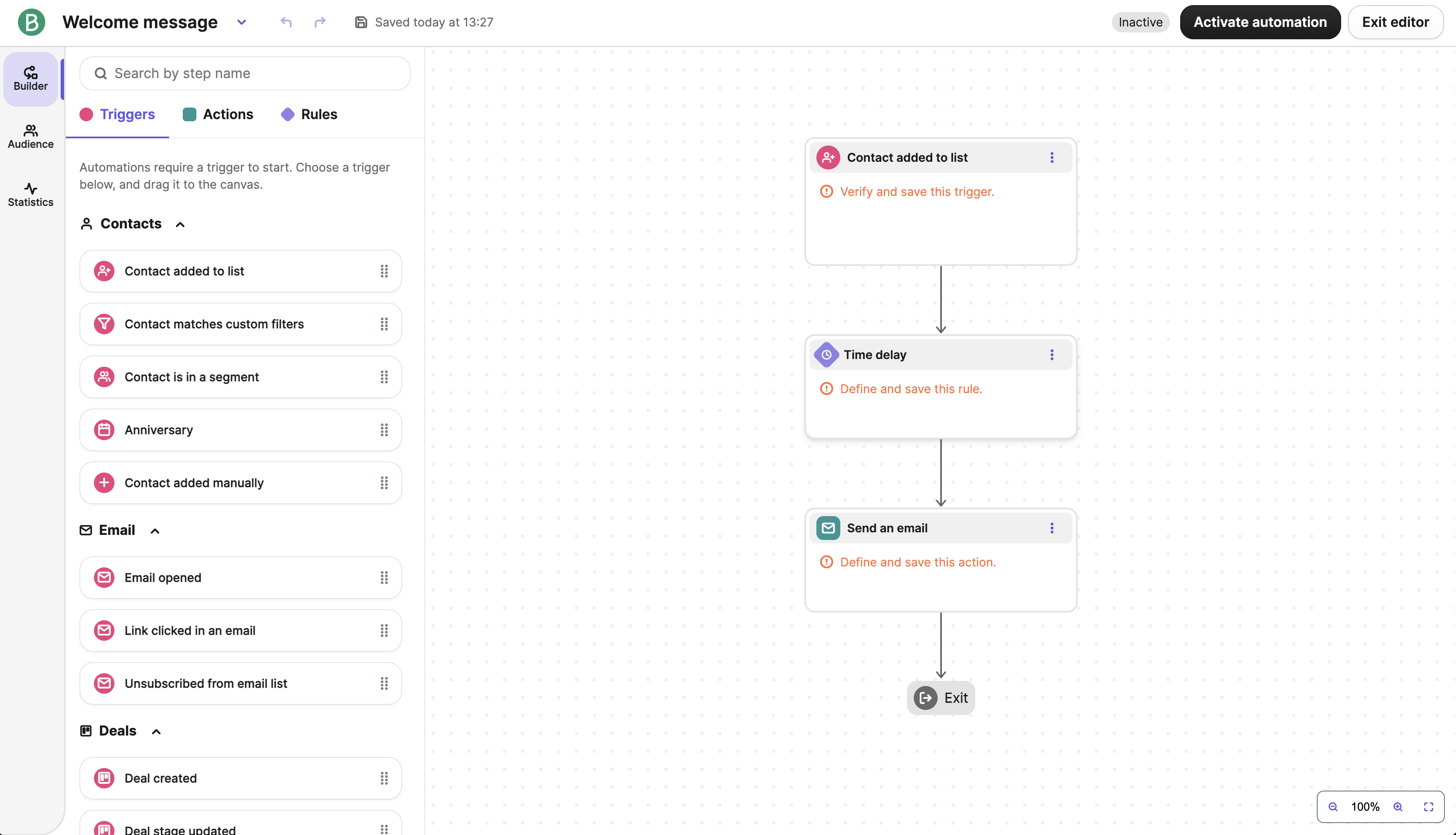 For example, here’s Brevo’s automation builder, which is one of the most intuitive ones I’ve used so far: