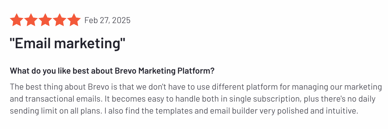 Brevo is doing quite well on all review platforms I’ve researched and has a variety of feedback. Some users like the fact that you can handle both your marketing and transactional emails via a single platform: