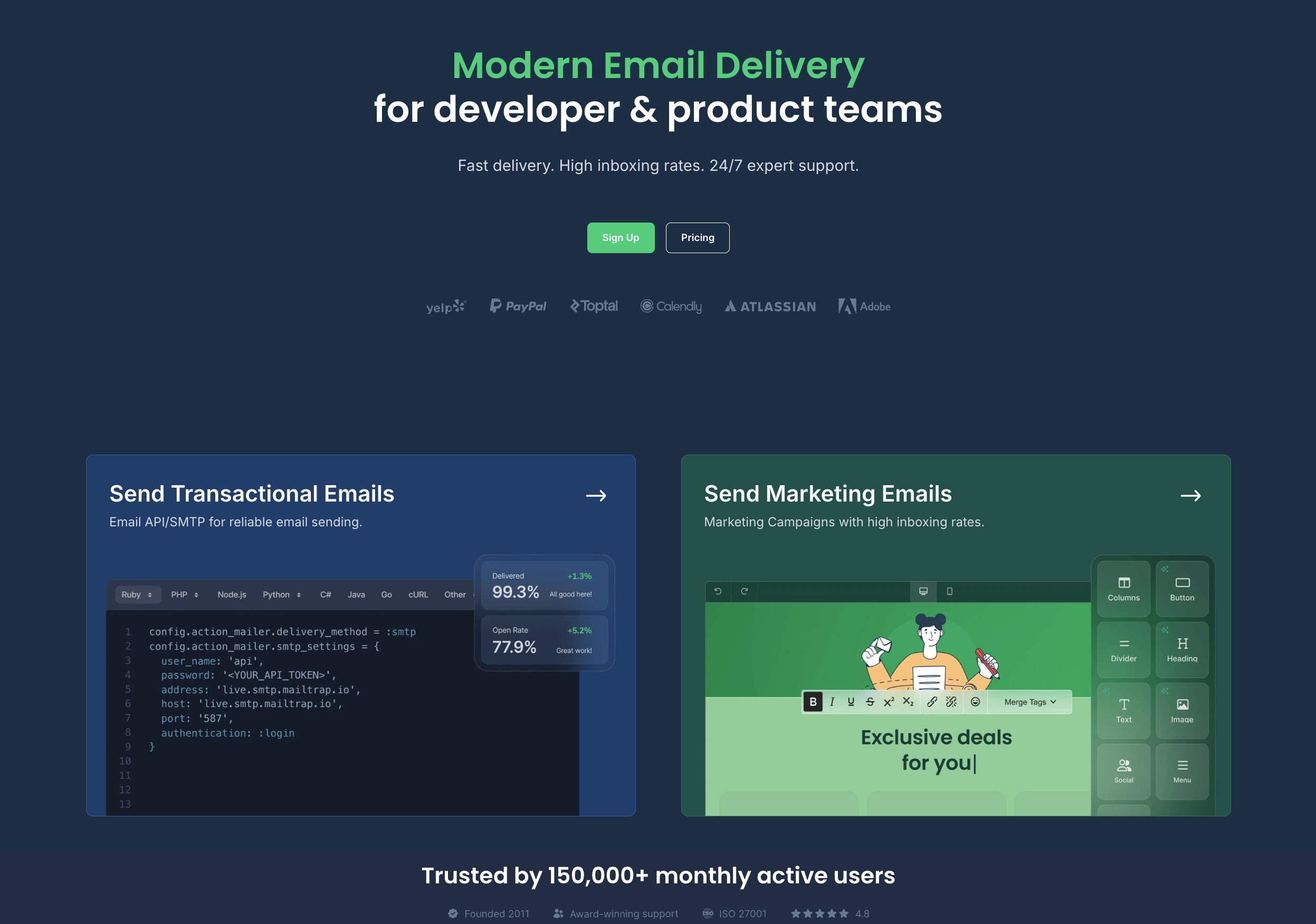 Mailtrap is suitable for products that send thousands, as well as large enterprises that send millions of emails per month. It has both solutions, Email API and SMTP service, to allow for easy and smooth integration.