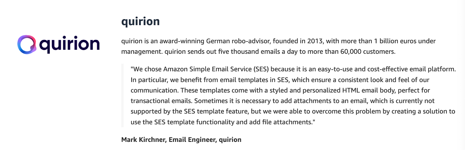 Amazon SES also has a customers page, where I found a lot of big names, but most importantly, some FinTech companies as well. One of them, Quirion, a European robo-advisor / financial investment company, says that they not only enjoyed the affordability that comes with SES, but also its transactional email templates, which they used for personalized transactional emails.