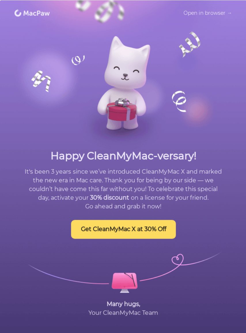This email from MacPaw is targeted at all existing users to invite them to celebrate the anniversary of CleanMyMac being on the market. By offering a gift of 30% off on the software for a referral, the email both shows appreciation to their existing users and encourages them to invite new users.