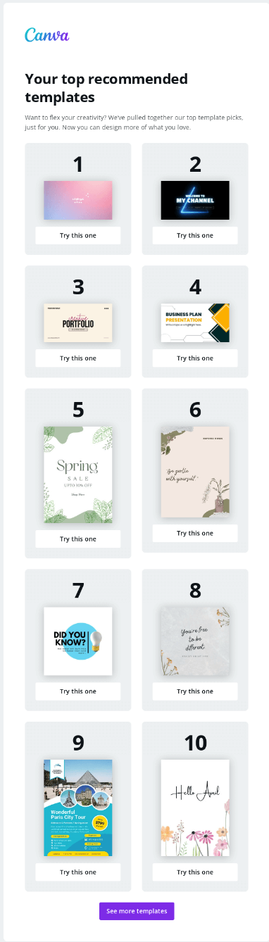 Here’s a recommendation email from Canva to keep the users engaged with the service. They’ve created a list of templates for the user to try, including templates of different sizes, orientations, and designs. While this email can target a wide audience, each user can find one that meets their project needs while sensing a personal touch from the Canva team.