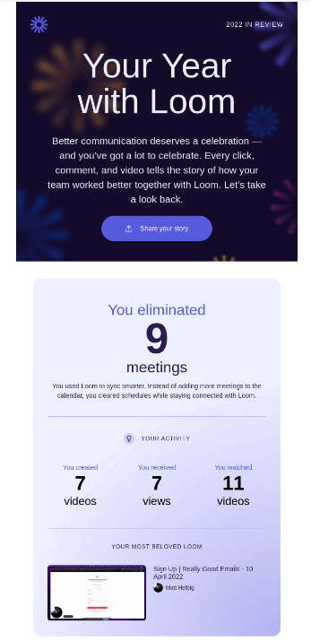 There’s Loom’s way of sharing a customer success story tailored to the user’s personal experience with the service. The email reminds the user how they benefitted from using the service, i.e., they saved time by not sitting through 9 meetings. And, of course, there’s a CTA to encourage sharing their story for a wider reach.