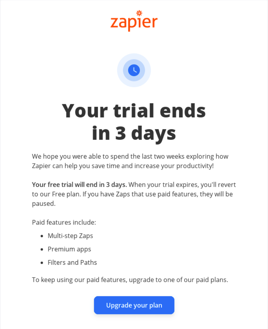 SaaS model companies often offer a free trial to new customers, but not all users upgrade to a paid plan after the trial ends. So free trial reminders are a great way to nurture and keep users engaged. This way, they’ll more likely be using the product during the trial to see how it solves their problem and maybe get to continue using the service afterward.