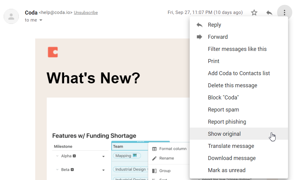 Let’s say, you’ve set up the list-unsubscribe header to you email campaign. Check out whether it works by sending an email to a test inbox. For Gmail, you’ll see the unsubscribe option in the header right next to the sender name. Also, you can verify headers in detail. For this, click the three dots near the Reply button and choose “Show original” in the dropdown menu.