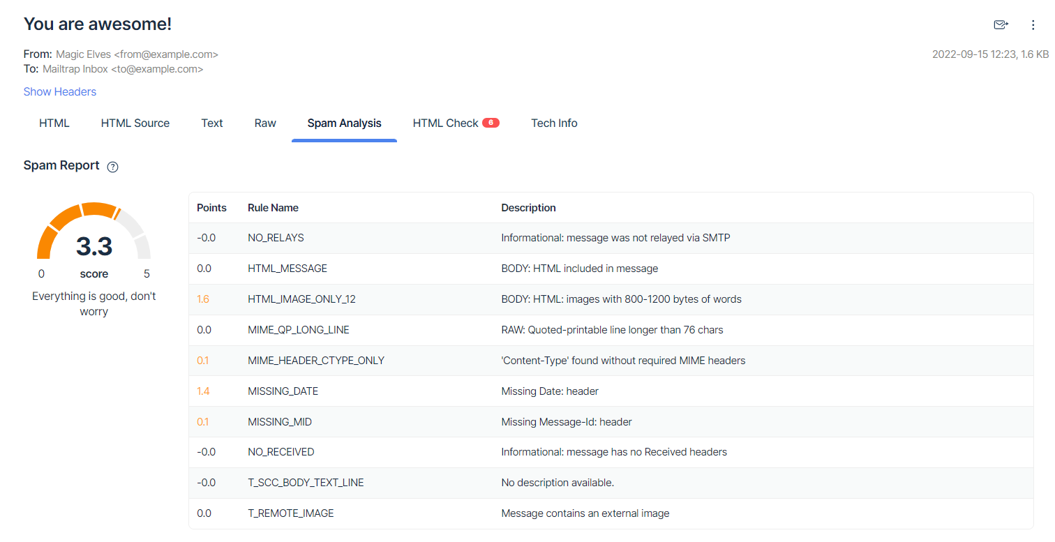 Email Sandbox is a safe email testing environment designed especially for developers. With the Sandbox, you can catch any outgoing SMTP traffic and analyze it for spam. The spam analysis report is verified through an integrated Apache SpamAssassin filter and helps you understand what elements of an email need to be changed or corrected for a better spam score.