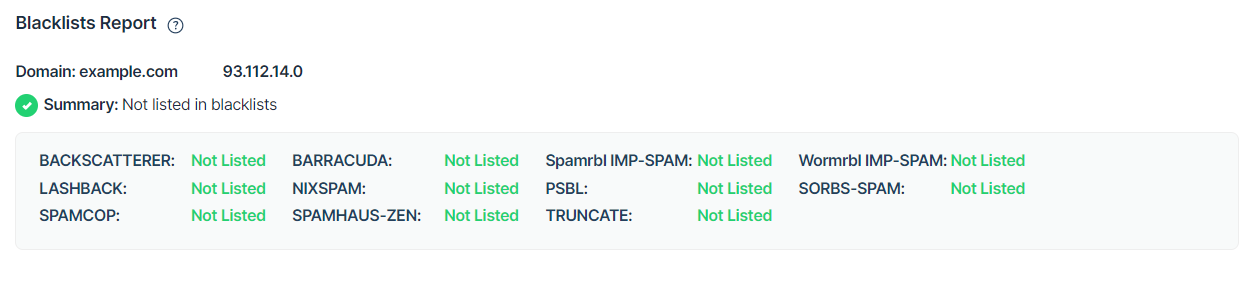 Additionally, in the Spam Analysys tab, your IP address is checked against the most popular DNS blacklists and alerts in case it appears in any.