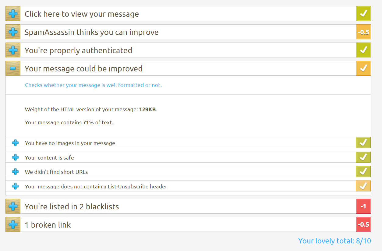After that, simply click “Then Check Your Score” to get both score and a detailed spam report on your email. And yes, Mail Tester will flag it if the list-unsubscribe header is missing. See how this looked with our test email: