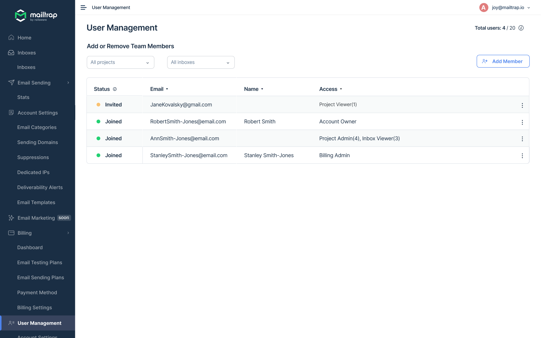 Desde el plan Business en adelante, en Mailtrap Email API, puedes agregar usuarios a tu cuenta y gestionar sus permisos. Al hacer clic en User Management, podrás ver todos los usuarios en una cuenta específica, donde podrás agregar fácilmente nuevos miembros y asignar sus permisos.