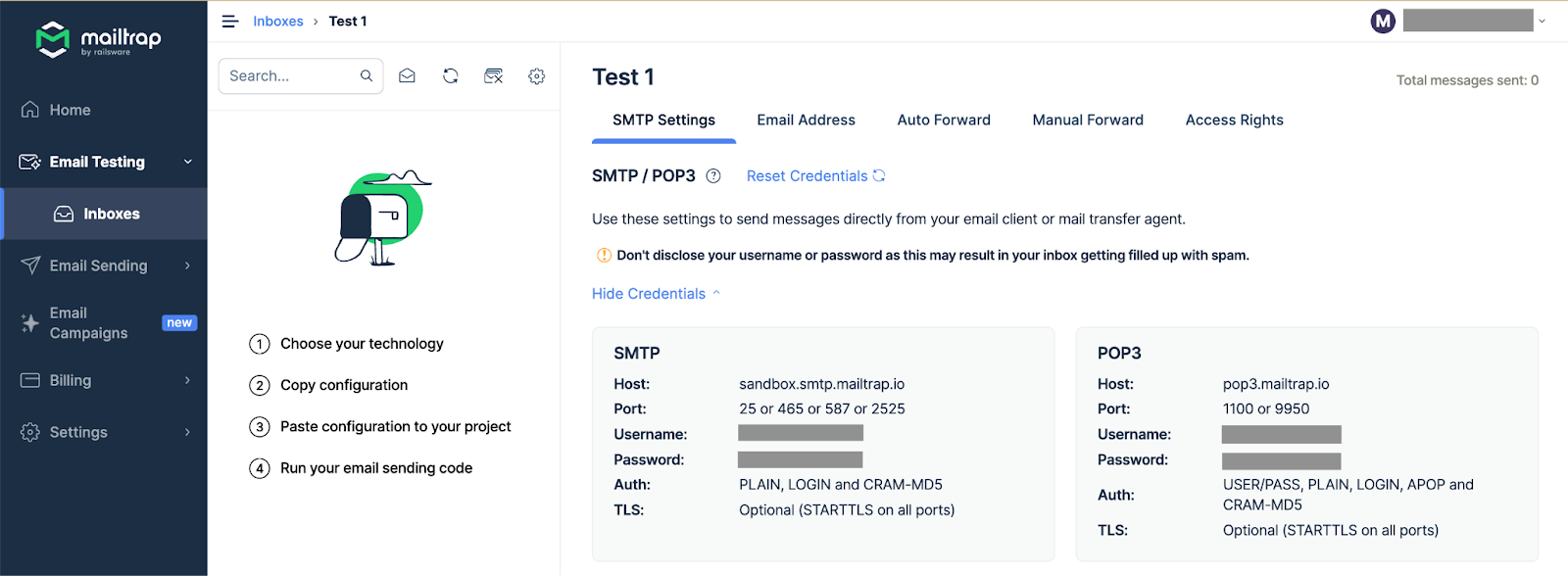 I simply added Email Sandbox SMTP credentials to this script and waited for the email to arrive in the virtual inbox.