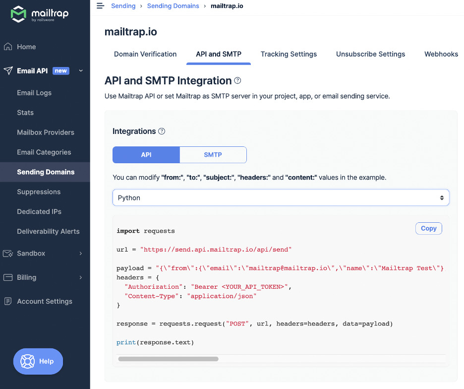 Sending with Mailtrap Email API can be initiated after you have created a Mailtrap account, added and verified a domain, and pasted the email sending code snippet into your project.