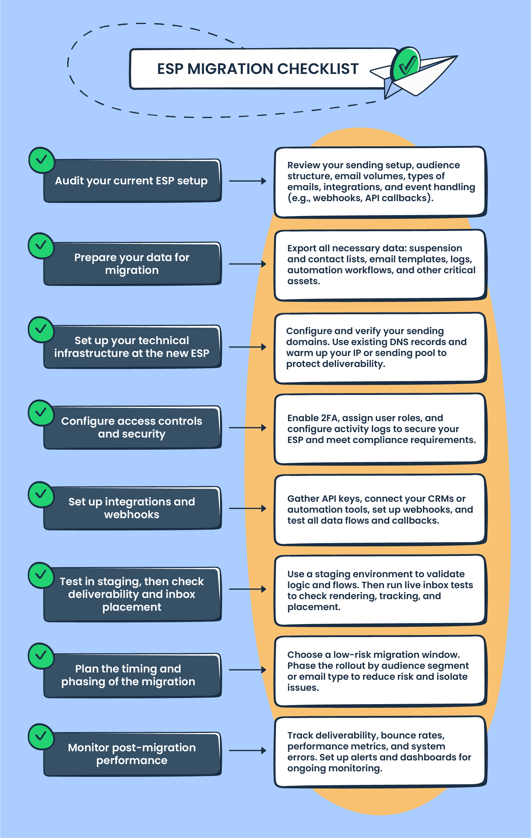 Yes, ESP migration is a big deal, yet with a clear plan, you can change the provider without breaking operation, data losses, and deliverability drops.