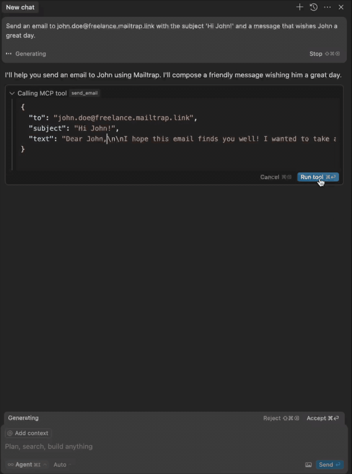 With the Mailtrap MCP server, you can send emails from your AI IDE without having to write a single line of code or leave your editor for a second. This includes: