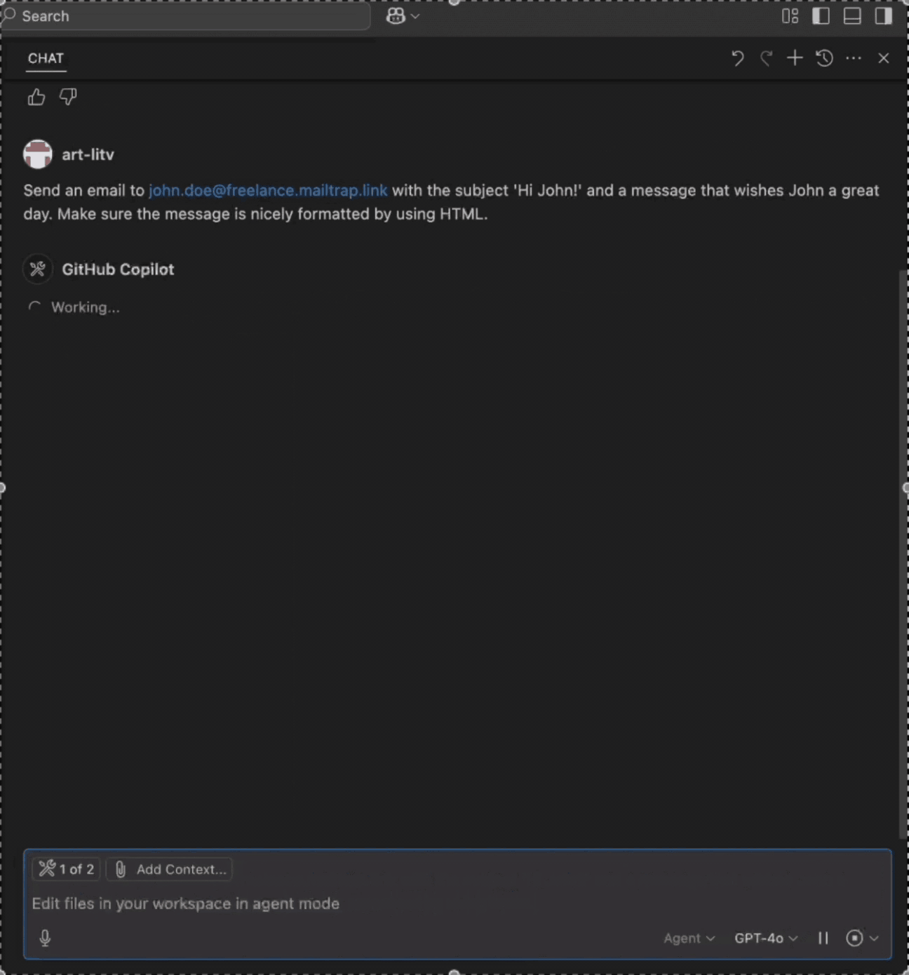 For a detailed set of instructions on how to use Mailtrap MCP server with Visual Studio Code, click here. ⬅️