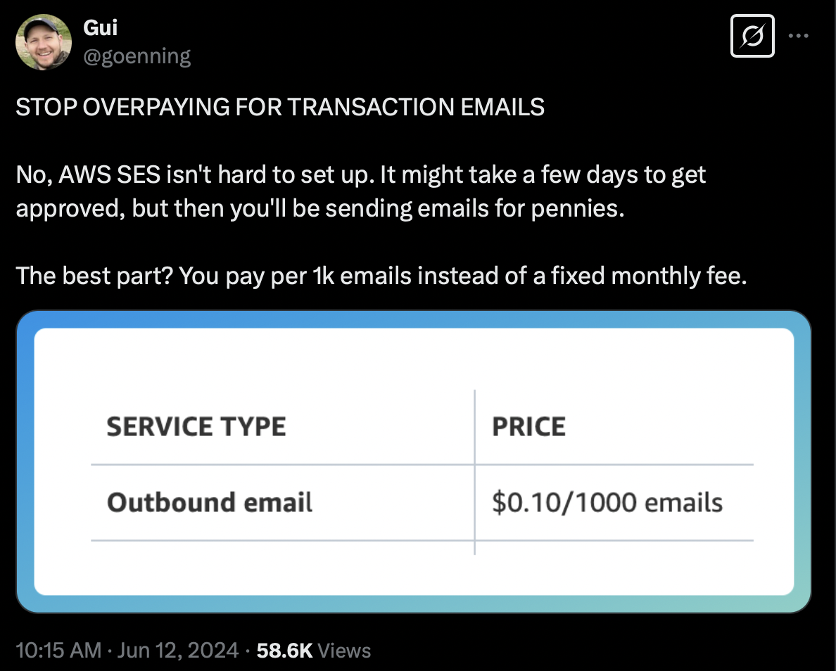 | Amazon SES | 3,000 per month (during the first year) | $0.10 per 1,000 emails |