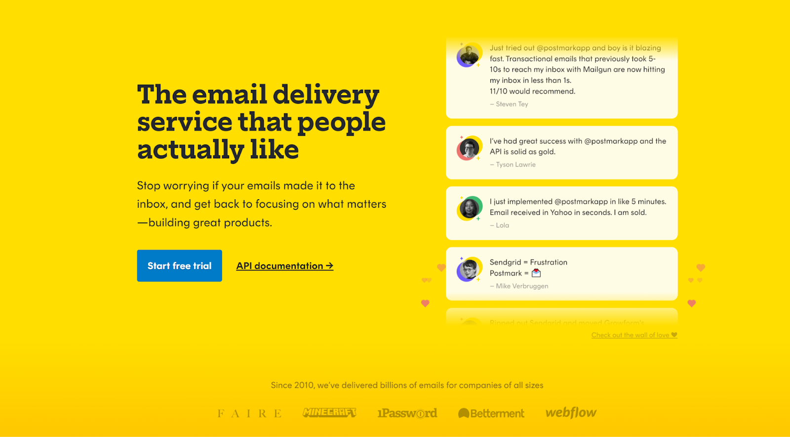 When it comes to customer experience and Postmark, I didn’t have to look far since the platform displays positive customer reviews on its homepage.