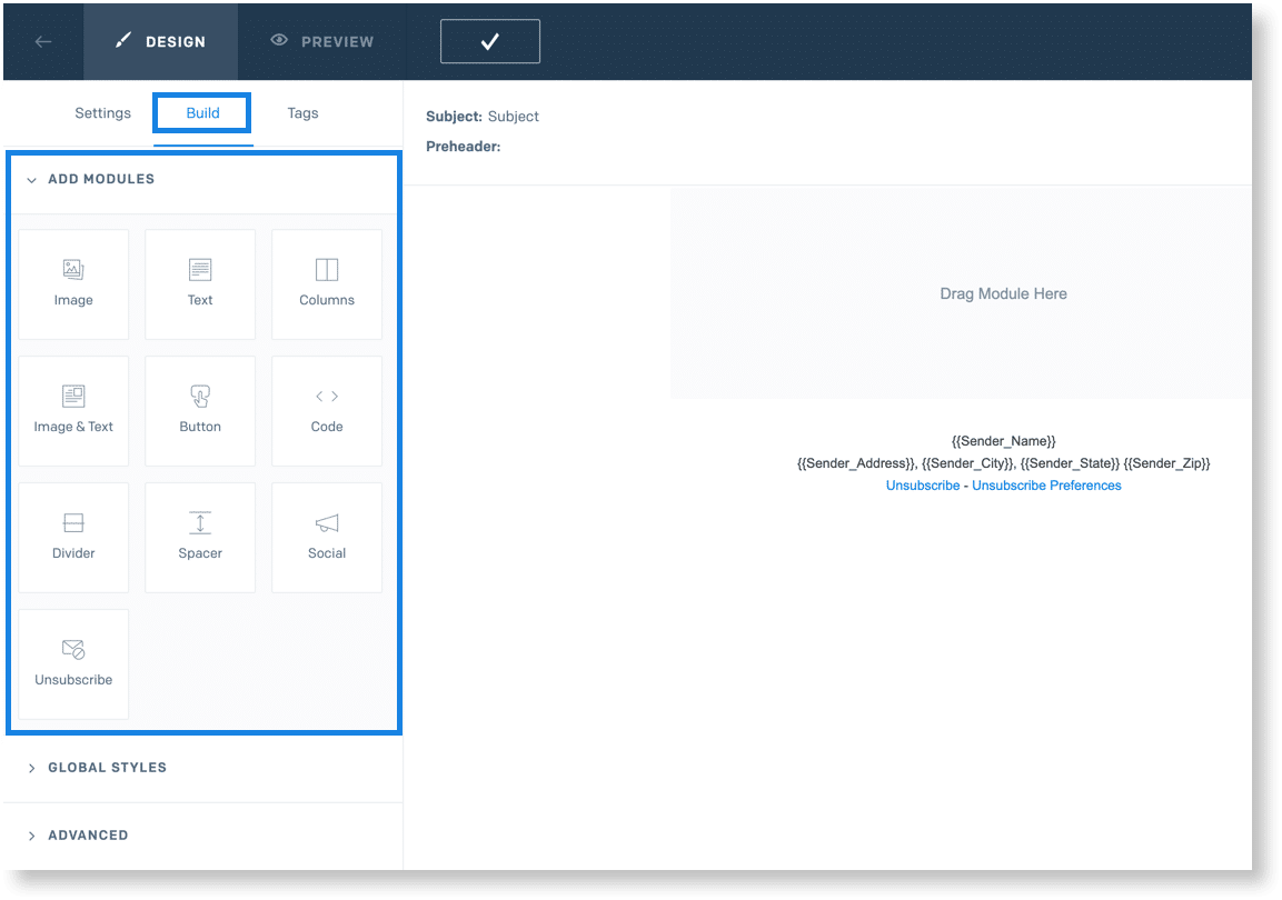 SendGrid also offers templates and a drag & drop builder, referred to as a design editor. You can pick from a number of blocks, add and move them freely around the design, as well as edit the HTML behind each.