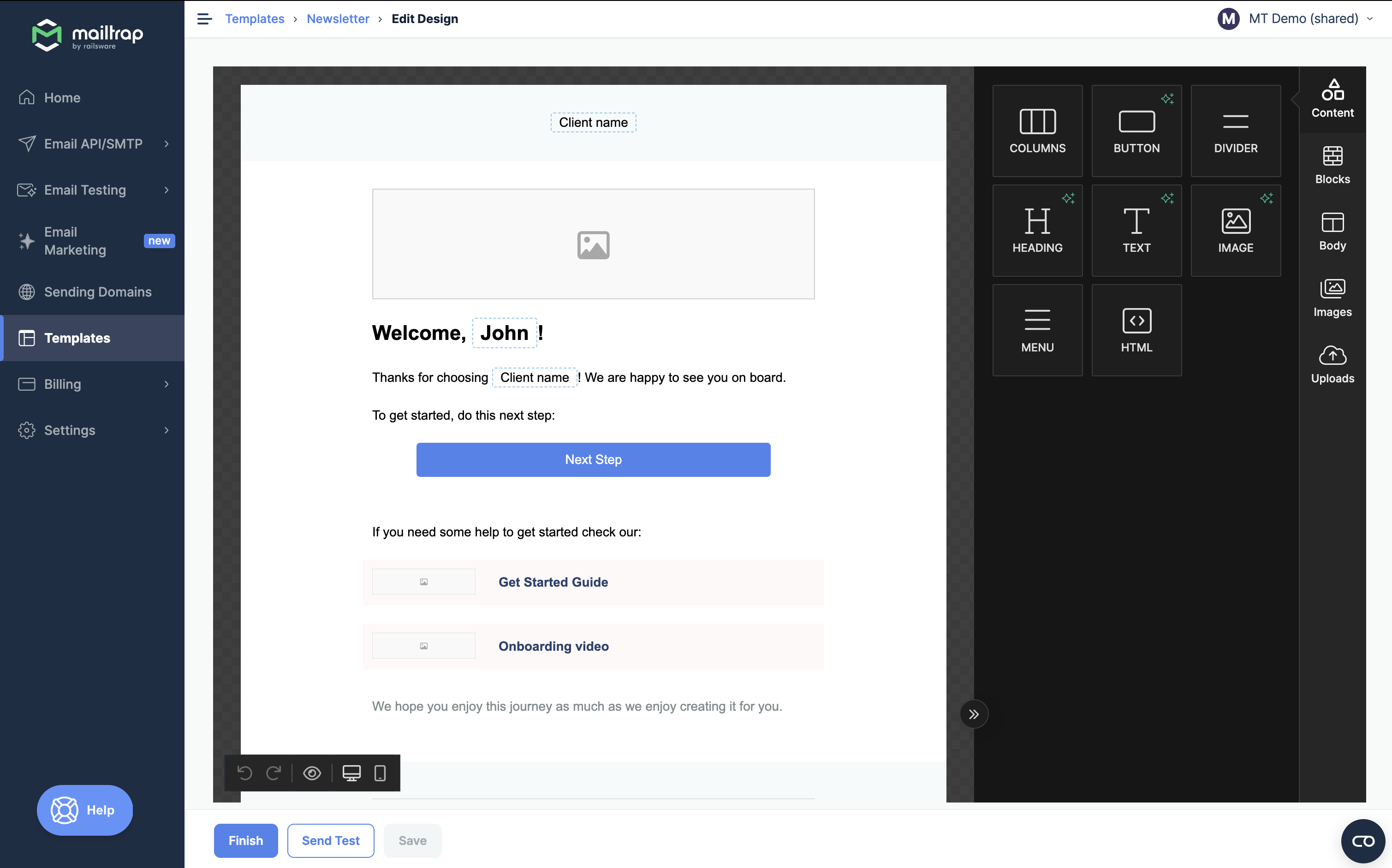 Mailtrap ha editor drag-and-drop e di codice, e puoi scegliere l’opzione desiderata. Troverai anche modelli pronti per aiutarti a familiarizzare con gli editor e ricostruire facilmente i vecchi modelli. Leggi di più qui.